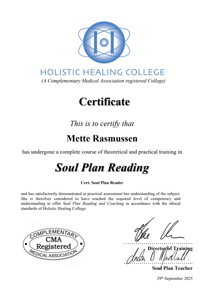 Jeg er certificeret Soul plan Practitioner gennem Holistic Healing College i England som jeg varmt kan anbefale. Er du nysgerrig kan du besøge deres website her: https://www.healingcollege.co.uk/